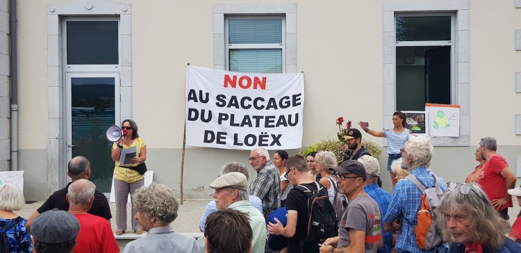En Haute-Savoie, il y a décidément de plus en plus de chantiers qui sont durs à avaler. Les travaux de remblais qui ont été effectués récemment sur le plateau de Loëx, en plein espace naturel sensible pourtant strictement protégé, ont provoqué ce vendredi 29 juillet 2022 le rassemblement d’une centaine de personnes devant la mairie d’Arthaz-Pont-Notre-Dame :