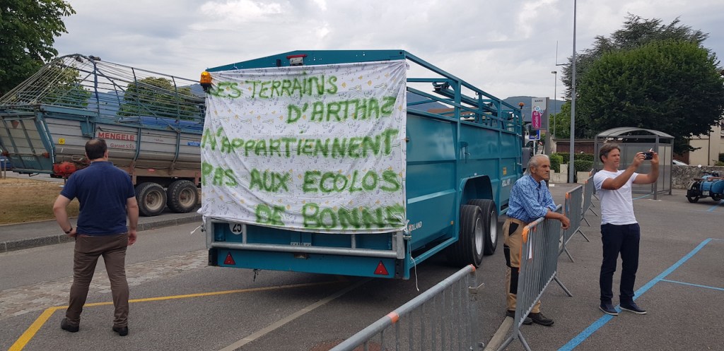 Ce vendredi matin, une manifestation a donc eu lieu devant la mairie d’Arthaz-Pont-Notre-Dame à partir de 10h, à l’appel de l‘APPL, afin de protester contre ces travaux de remblaiement effectués par des agriculteurs locaux en plein espace protégé. Malgré des barrages déployés en amont par les forces de l’ordre, une centaine de personnes ont pu se rassembler pendant plus d’une heure pour rappeler la nécessité de préserver ce territoire, mais également de respecter la loi. Des agriculteurs ont également tenté de perturber le rassemblement en klaxonnant pour couvrir la voix des manifestant.e.s et en barrant la route avec plusieurs tracteurs monumentaux, certains affublés de slogans aussi subtils que : « les terrains d’Arthaz n’appartiennent pas aux écolos de Bonne ». Certes, mais ils n’appartiennent pas non plus uniquement aux agriculteurs locaux qui peuvent y faire ce qu’ils veulent, en particulier quand ils sont classés Espace naturel sensible.