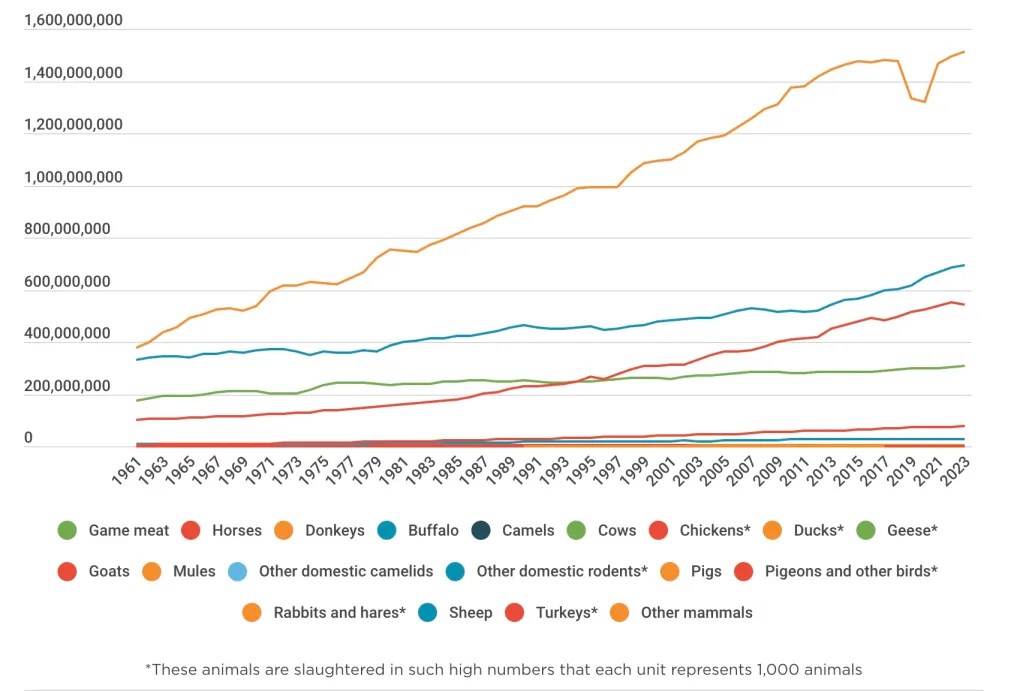 Un chiffre passé beaucoup trop inaperçu vaut beaucoup plus que de longs discours en la matière, celui de 1,7. Beaucoup connaissent désormais le « jour du dépassement », le jour de l’année où l’humanité a consommé l’ensemble des ressources disponibles sur un an en comparaison de la biocapacité, c’est-à-dire la capacité de la Terre à se régénérer[1]. Sur la question animale, il faut désormais 1,7 jour pour tuer autant d’animaux terrestres qu’il y a eu de morts durant toutes les guerres de l’Histoire (sans compter donc le massacre dans les mers et les océans). Et en 2014, il y a donc un peu plus de dix ans, ce chiffre était de 2,4 jours. Le carnage ne cesse donc d’empirer, malgré tous les débats qui fleurissent sur la nécessaire diminution de l’alimentation carnée.